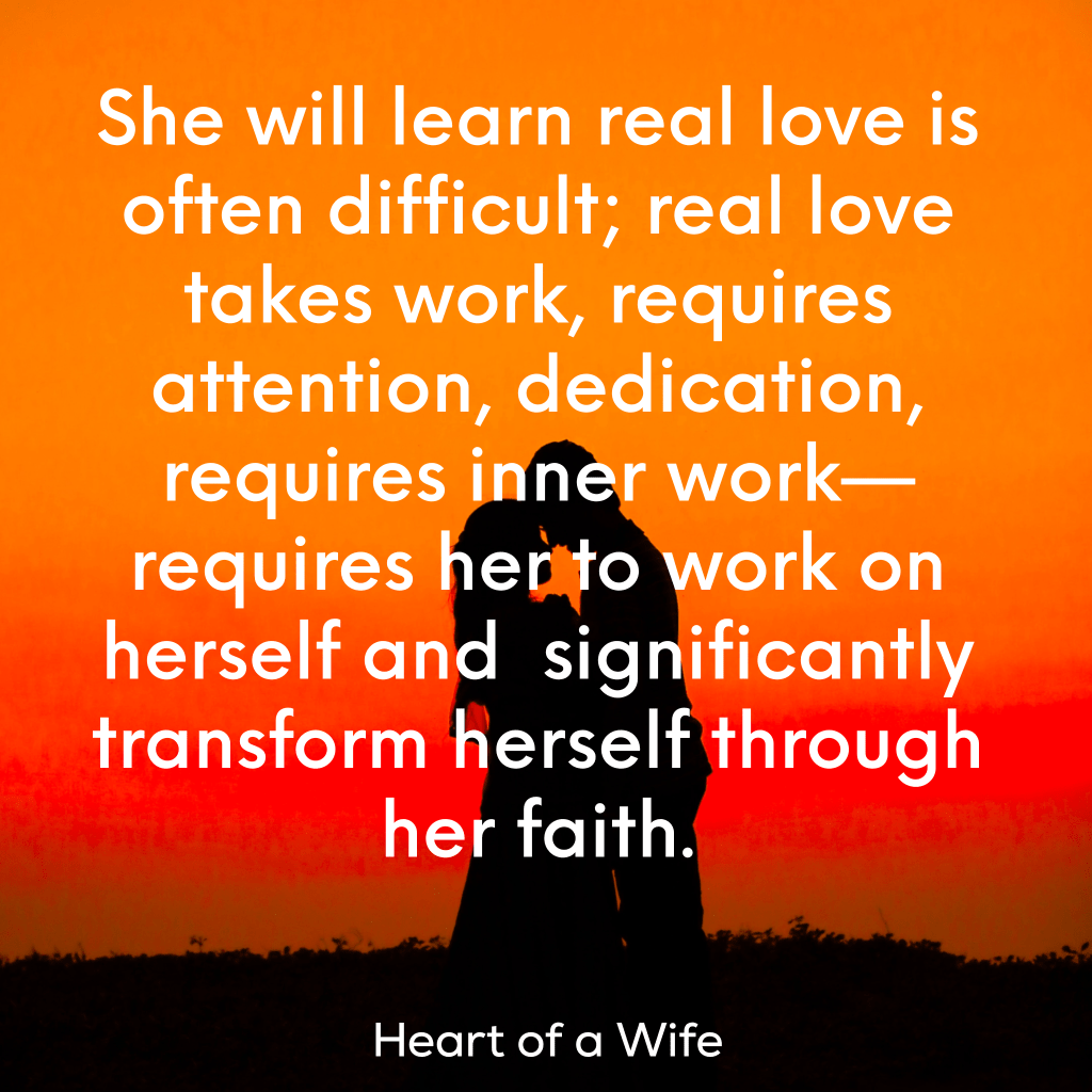 She will learn real love is often difficult; real love takes work, requires attention, dedication, requires inner work—requires her to work on herself and significantly transform her mind through her faith.